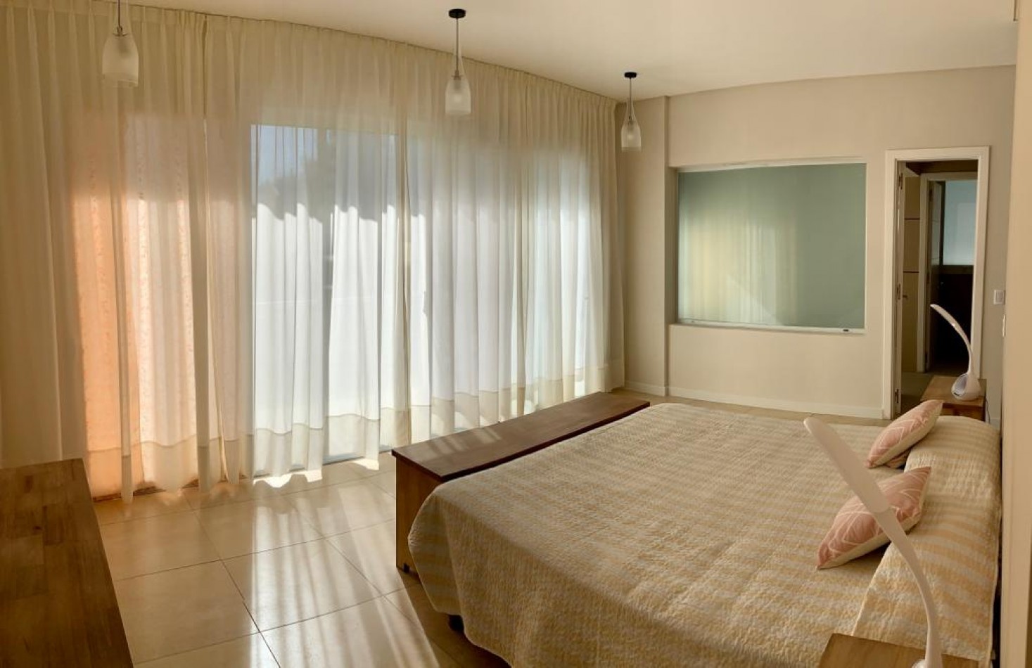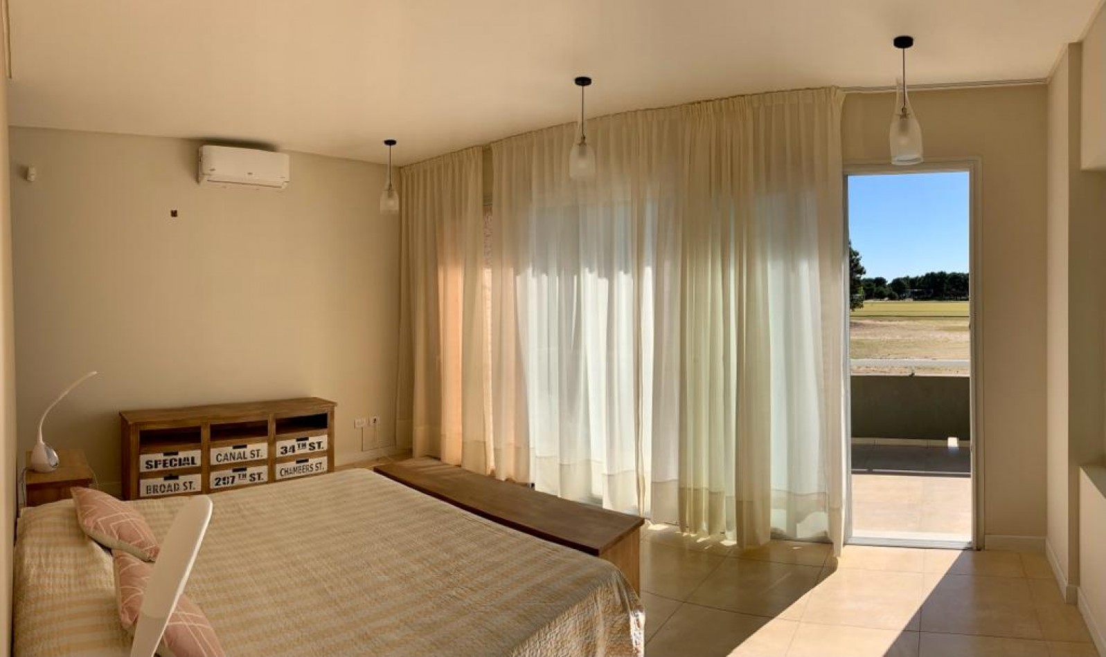 ·Planta alta: Dormitorio principal con cama matrimonial en suite, balcón con vista al jardín y a la cancha de polo.
