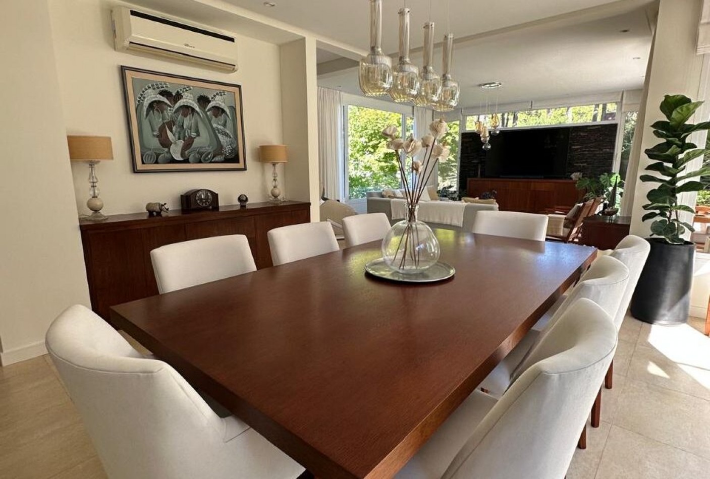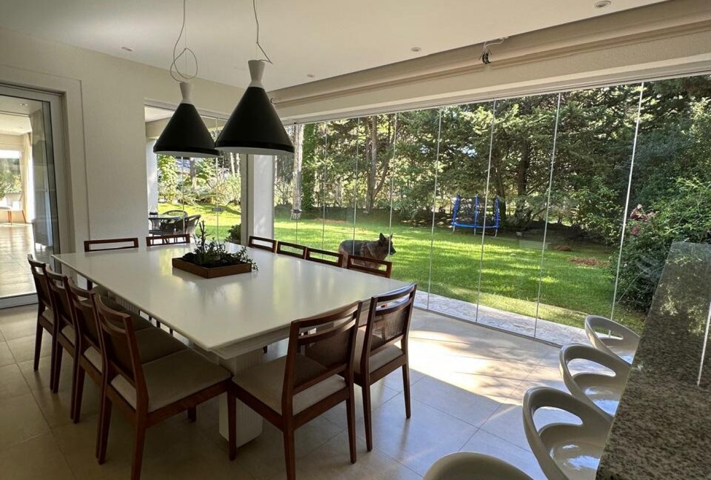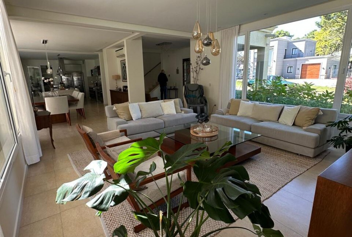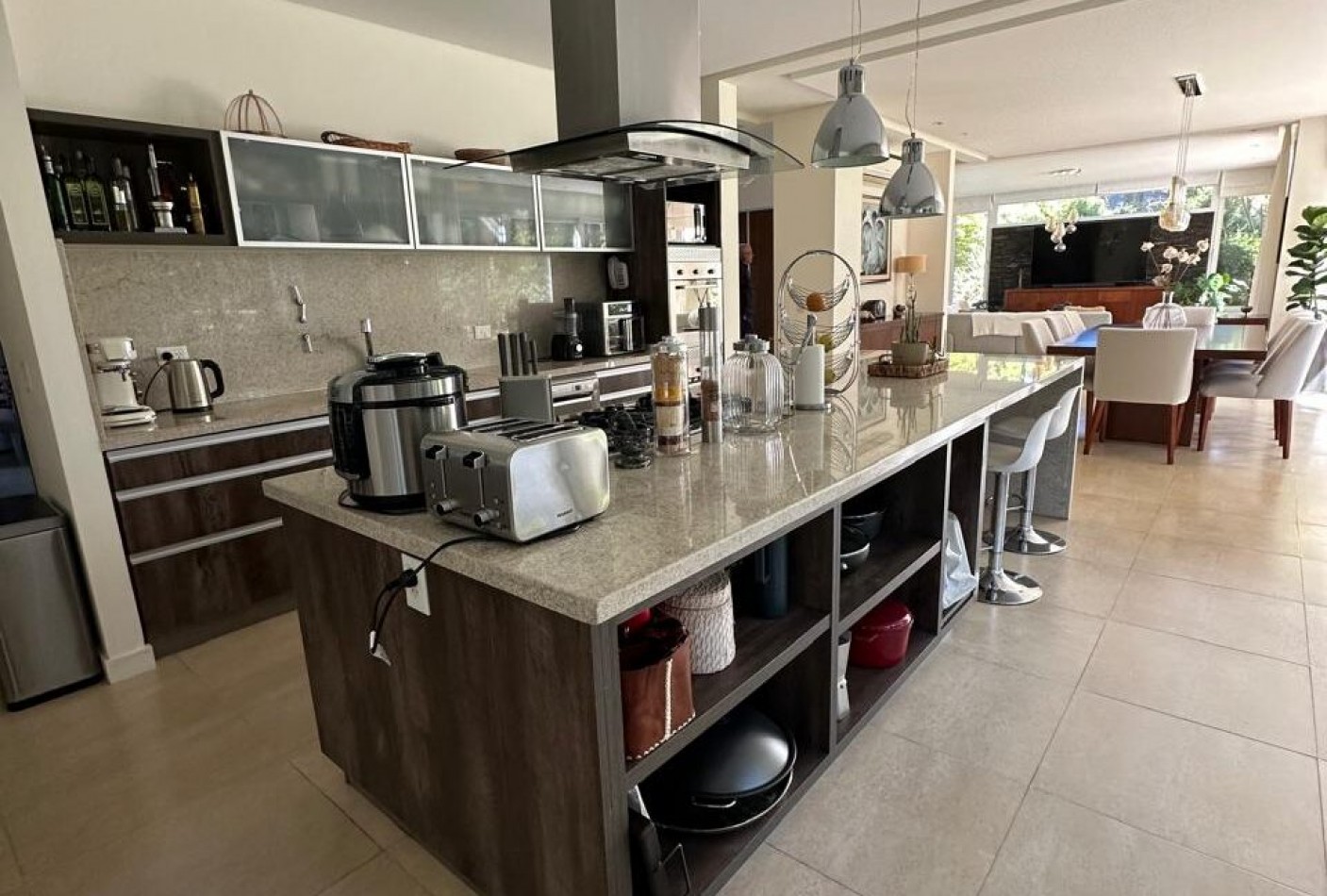 Hall de ingreso, amplios ambientes integrados que conforman el living, el comedor y la cocina. Toilette de recepción, dormitorio para huéspedes con baño en suite, lavadero independiente y dependencia de servicio con baño de generosas dimensiones. Sector de parrilla con barra, cerramiento en acero inoxidable y salida directa al jardín. Garage cerrado para dos vehículos y amplios espacios verdes alrededor de la casa.