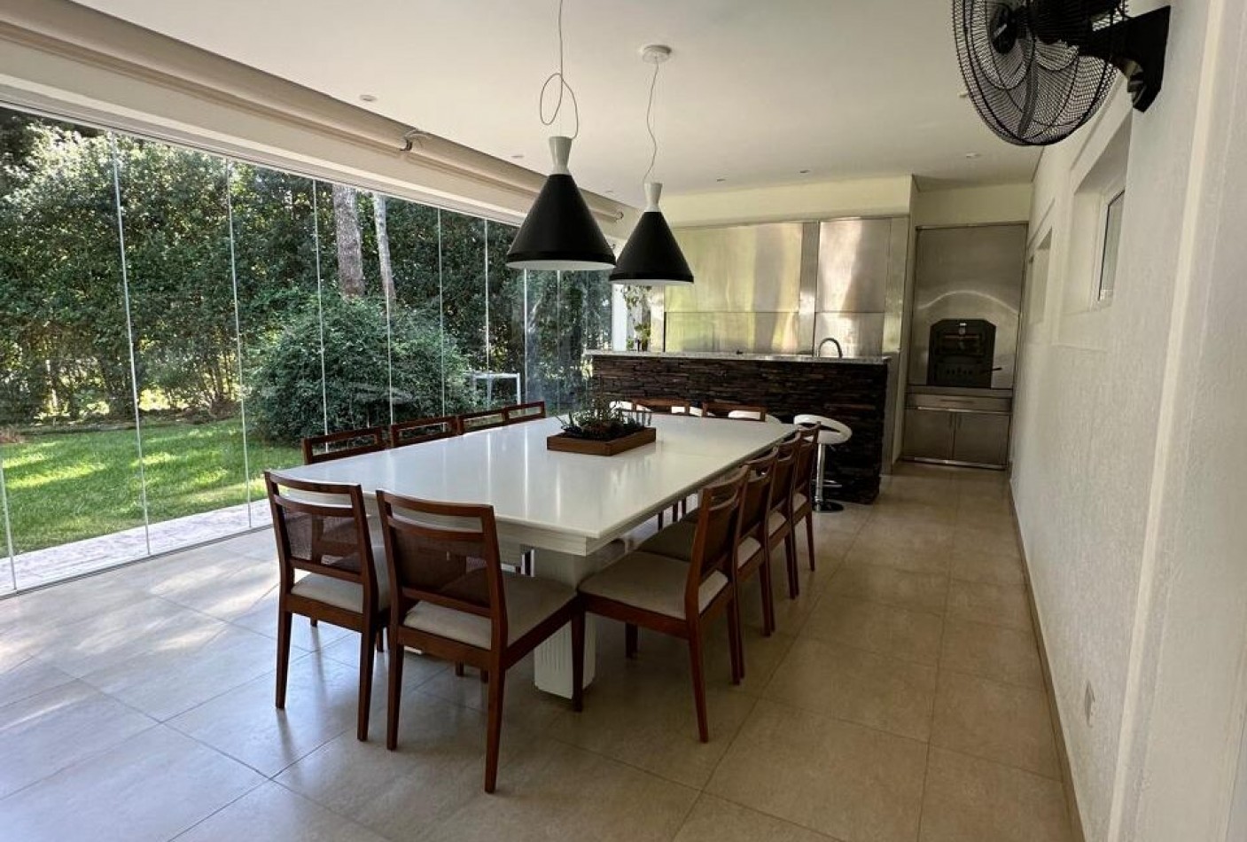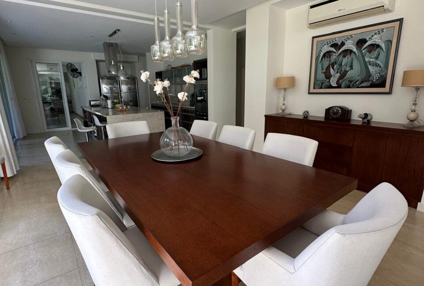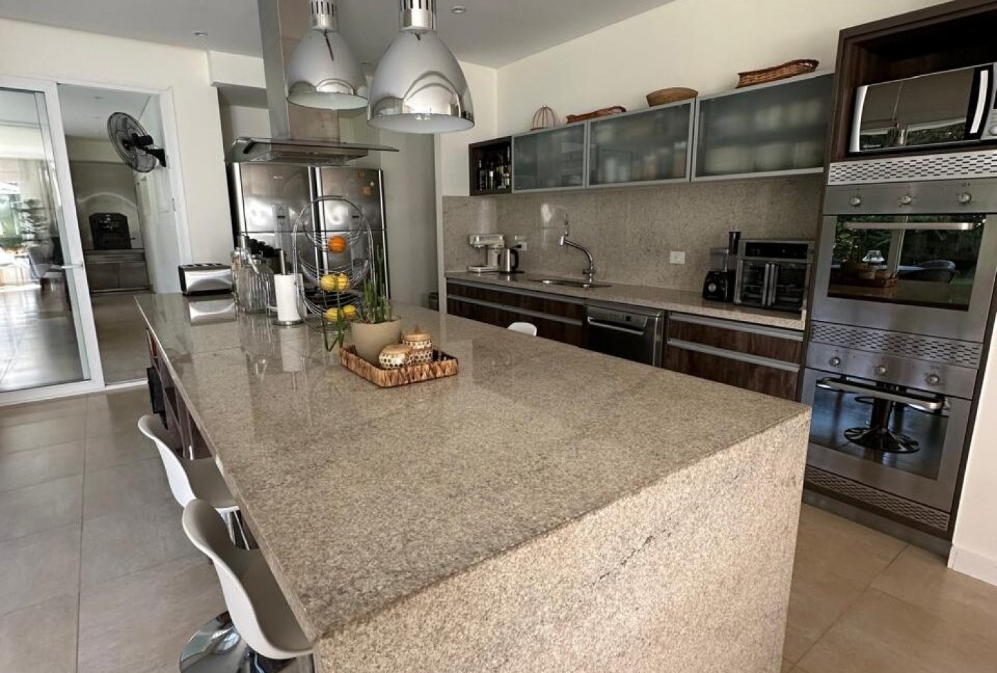 Hall de ingreso, amplios ambientes integrados que conforman el living, el comedor y la cocina. Toilette de recepción, dormitorio para huéspedes con baño en suite, lavadero independiente y dependencia de servicio con baño de generosas dimensiones. Sector de parrilla con barra, cerramiento en acero inoxidable y salida directa al jardín. Garage cerrado para dos vehículos y amplios espacios verdes alrededor de la casa.