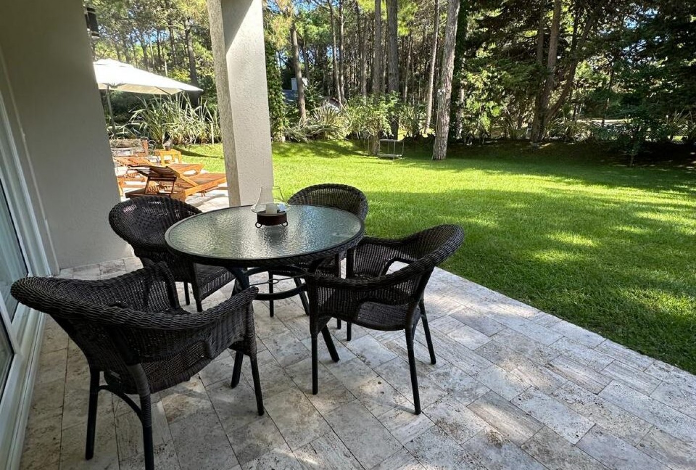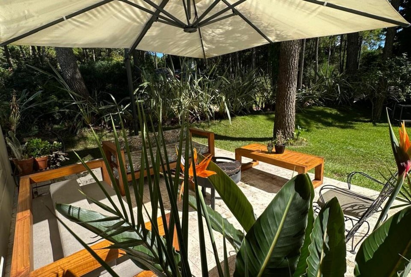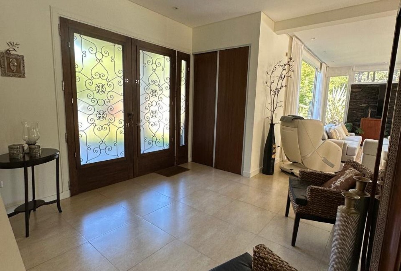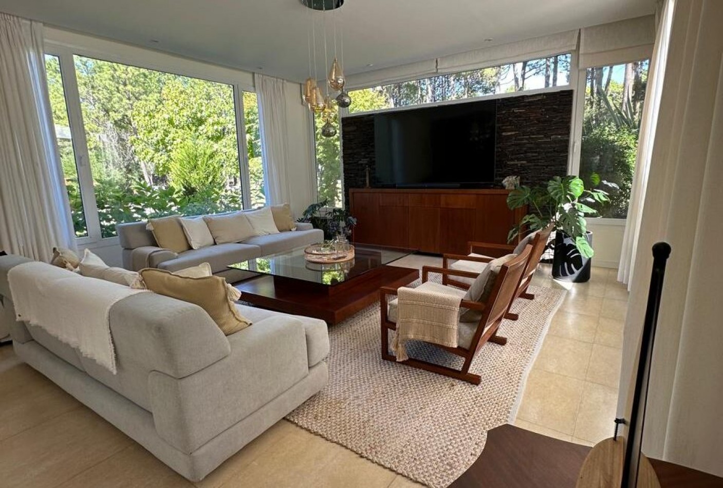 Hall de ingreso, amplios ambientes integrados que conforman el living, el comedor y la cocina. Toilette de recepción, dormitorio para huéspedes con baño en suite, lavadero independiente y dependencia de servicio con baño de generosas dimensiones. Sector de parrilla con barra, cerramiento en acero inoxidable y salida directa al jardín. Garage cerrado para dos vehículos y amplios espacios verdes alrededor de la casa.